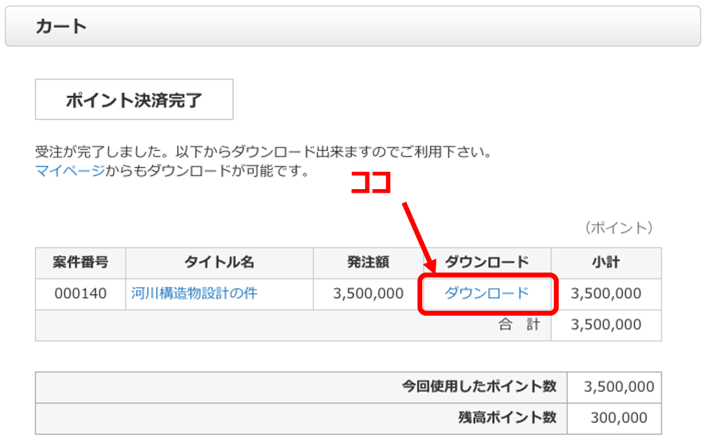 決済後、「ポイント決済完了」のページ内、「ダウンロード」から詳細情報ファイルをダウンロードしてください。