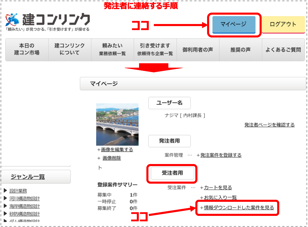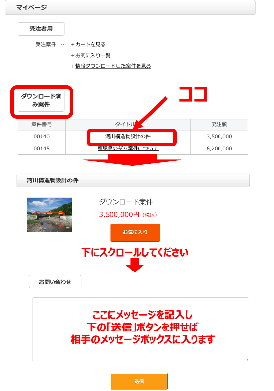 ダウンロードした案件情報を確認後、受注を希望する場合は、発注者にサイト内メッセージにてその旨を伝え、やりとりを開始します。