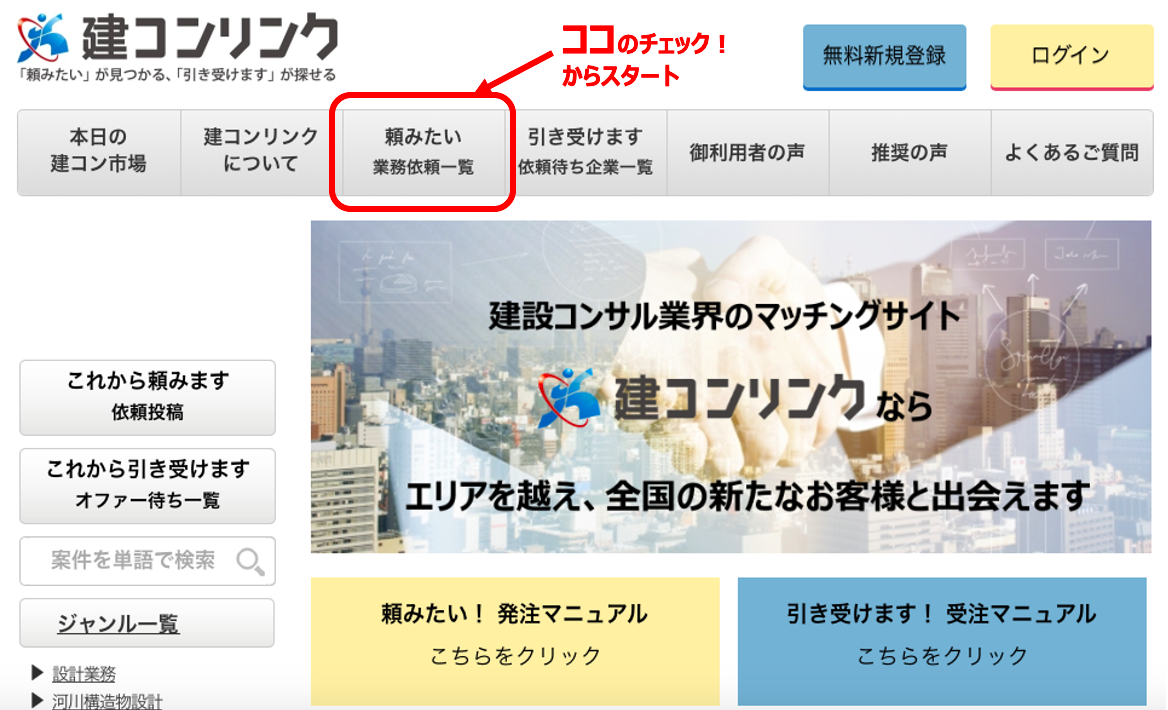 1)画面上部メニュー内の「頼みたい 業務依頼一覧」をクリックし、現在依頼が出されている案件をチェックします。