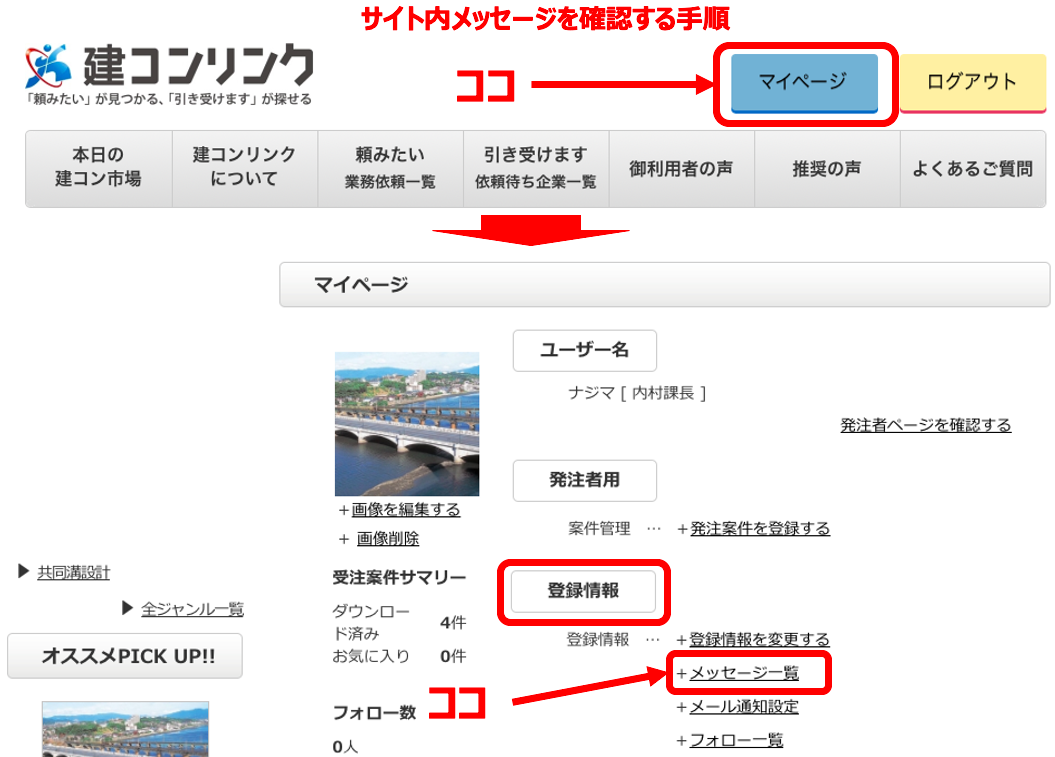 2)「購入」者が案件を検討し受注を希望する場合、その旨がサイト内のメッセージボックスに届きます。「マイページ」→「登録情報」→「メッセージ一覧」から受信メールを随時確認してください。
